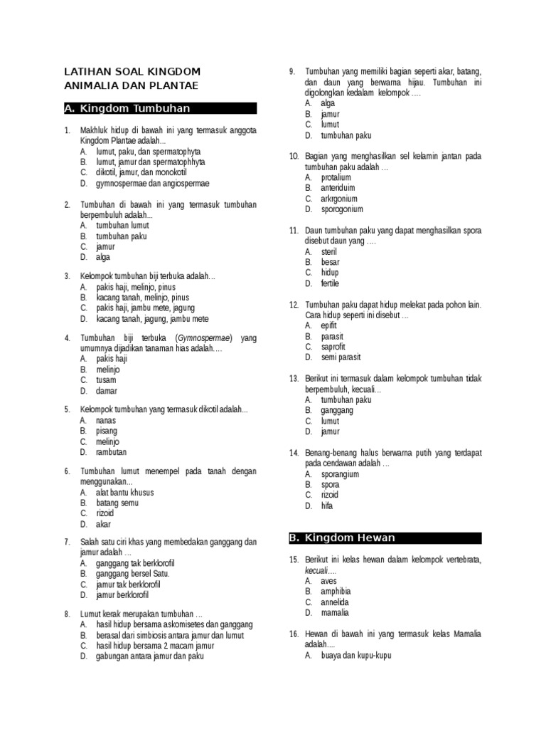 Dua kelompok besar tersebut disebut kingdom oleh Linnaeus jadi terdapat kingdom animalia hewan dan plantae tumbuhan. 1- 15 Soal Kingdom Plantae Pilihan Ganda dan Jawaban. A Bakteri termasuk ke dalam kingdom Monera.